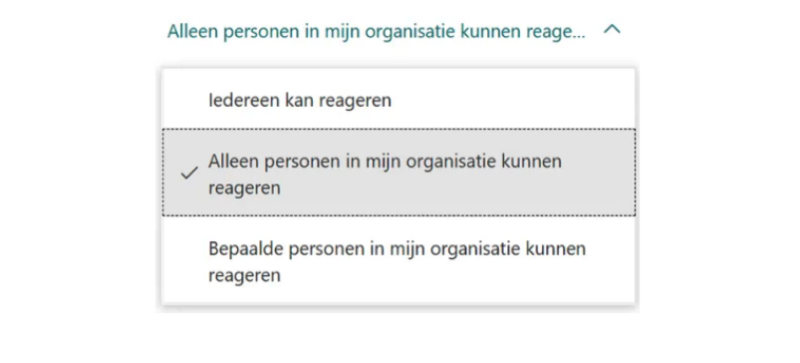 Bij een quiz kun je het goede antwoord aangeven en een score toevoegen. Na het aanmaken van het formulier of een quiz, kun je deze delen. Je kunt kiezen voor ‘Iedereen kan reageren’, ‘Alleen personen in mijn organisatie kunnen reageren’, of ‘Bepaalde personen in mijn organisatie kunnen reageren’. Wanneer je kiest voor ‘Iedereen kan reageren’ zijn de antwoorden automatisch anoniem.