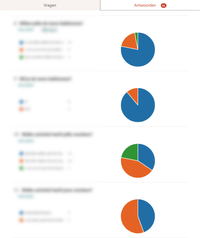 De resultaten van je onderzoek kun je eenvoudig via Excel analyseren en interpreteren. Microsoft Forms heeft een geïntegreerd dashboard waar je realtime alle resultaten kunt zien. Op het dashboard kun je bijvoorbeeld zien hoeveel personen je formulier hebben ingevuld en hoe lang daar gemiddeld over is gedaan. Een samenvatting van alle antwoorden wordt visueel weergegeven door verschillende diagrammen en grafieken.
