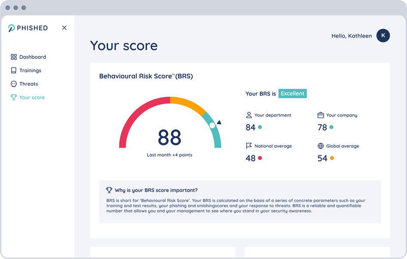 Hoe? Dankzij de Phished Behavioural Risk Score™ (BRS). Dit unieke cijfer laat je in één oogopslag zien hoe veilig je organisatie is. Het meet hoe je medewerkers omgaan met phished threats, bekijkt hun training en geeft inzicht in hun cybergedrag. Het mooie is: de BRS wordt constant bijgewerkt, dus je weet altijd hoe je ervoor staat én waar je nog kunt verbeteren!